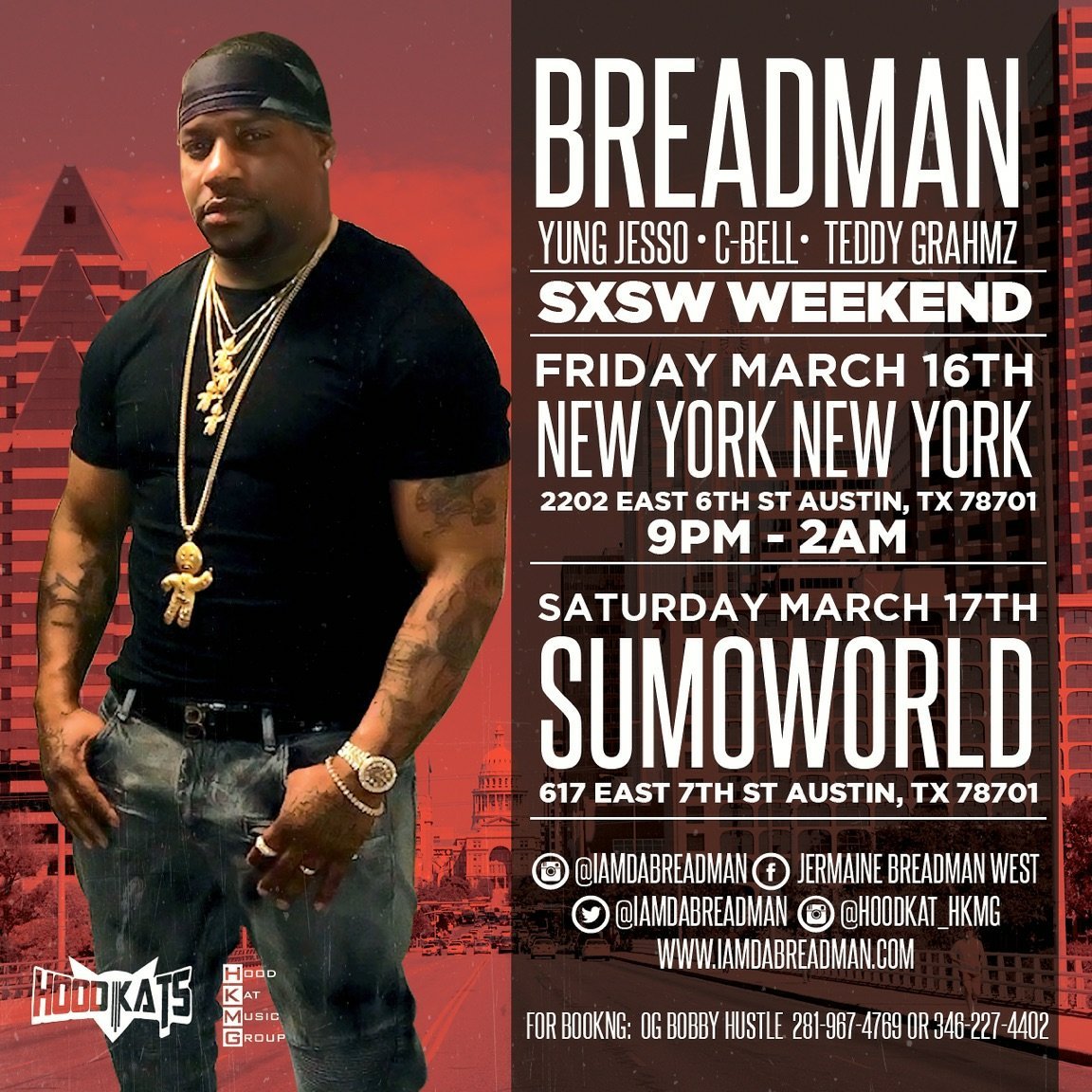 #SXSW @iamdabreadman @teddy_grahmz_hkmg & the whole @hoodkat_hkmg crew is invading #Austin 😎 Come out to catch the live performances at #NewYorkNewYork & #Sumoworld Friday & Saturday!#Breadman #HKMG #BillionaireBehavior #HoodKats #MIKODreamzPR #ATX #Houston #Texas #HTX #rappers (INTERVIEWS/MEDIA INQUIRIES: @hurricanearlene of @mikodreamz_pr)