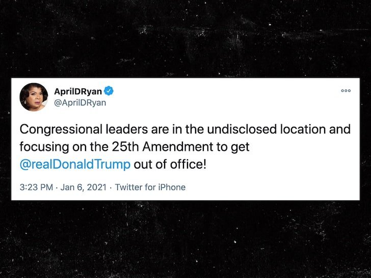 There’s a meeting going on right now at an undisclosed location in D.C. where a group of senators and members of Congress are talking about how to invoke the 25th Amendment to yank Trump from the White House … this according to American Urban Radio Networks White House Correspondent and legend April Ryan.