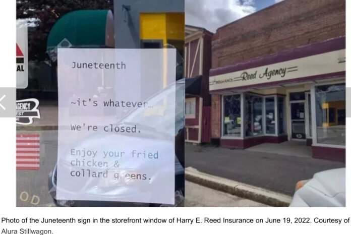 Maine resident Alura Stillwagon originally posted it on Facebook with the caption, “The racism in Millinocket is real.” Her photo showed a piece of paper taped in a storefront window, with print proclaiming, “Juneteenth.” The following lines added, “It’s whatever…we’re closed. Enjoy your fried chicken & collard greens.”