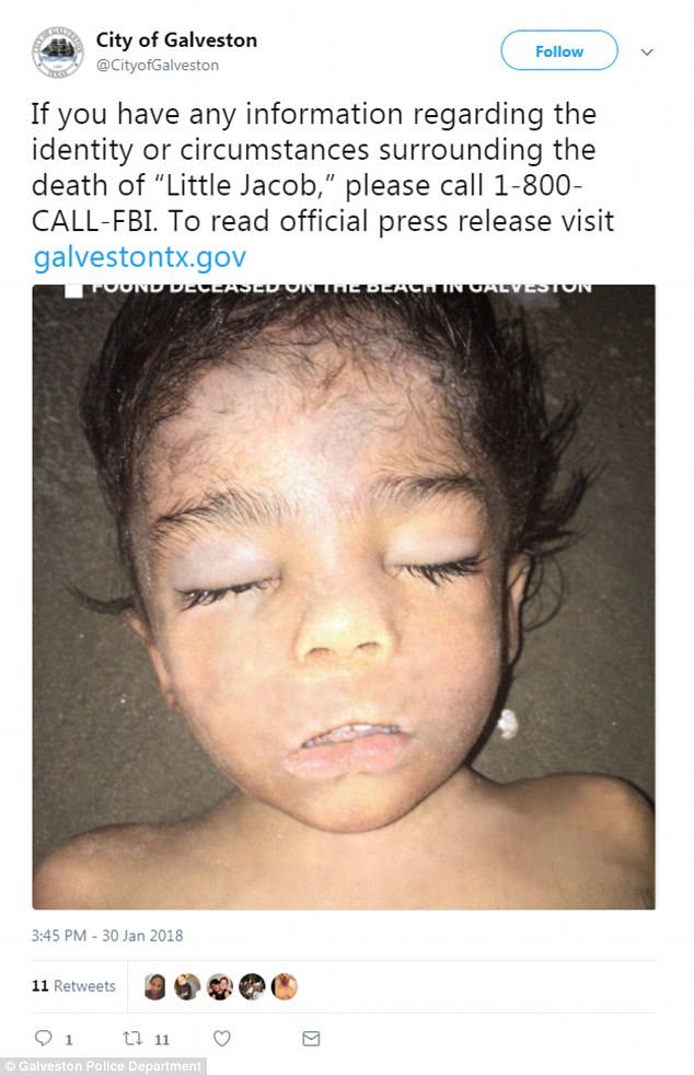 WARNING: GRAPHIC IMAGE. The body of the boy, dubbed ‘Little Jacob’ washed up on Galveston, Texas beach on October 20.
