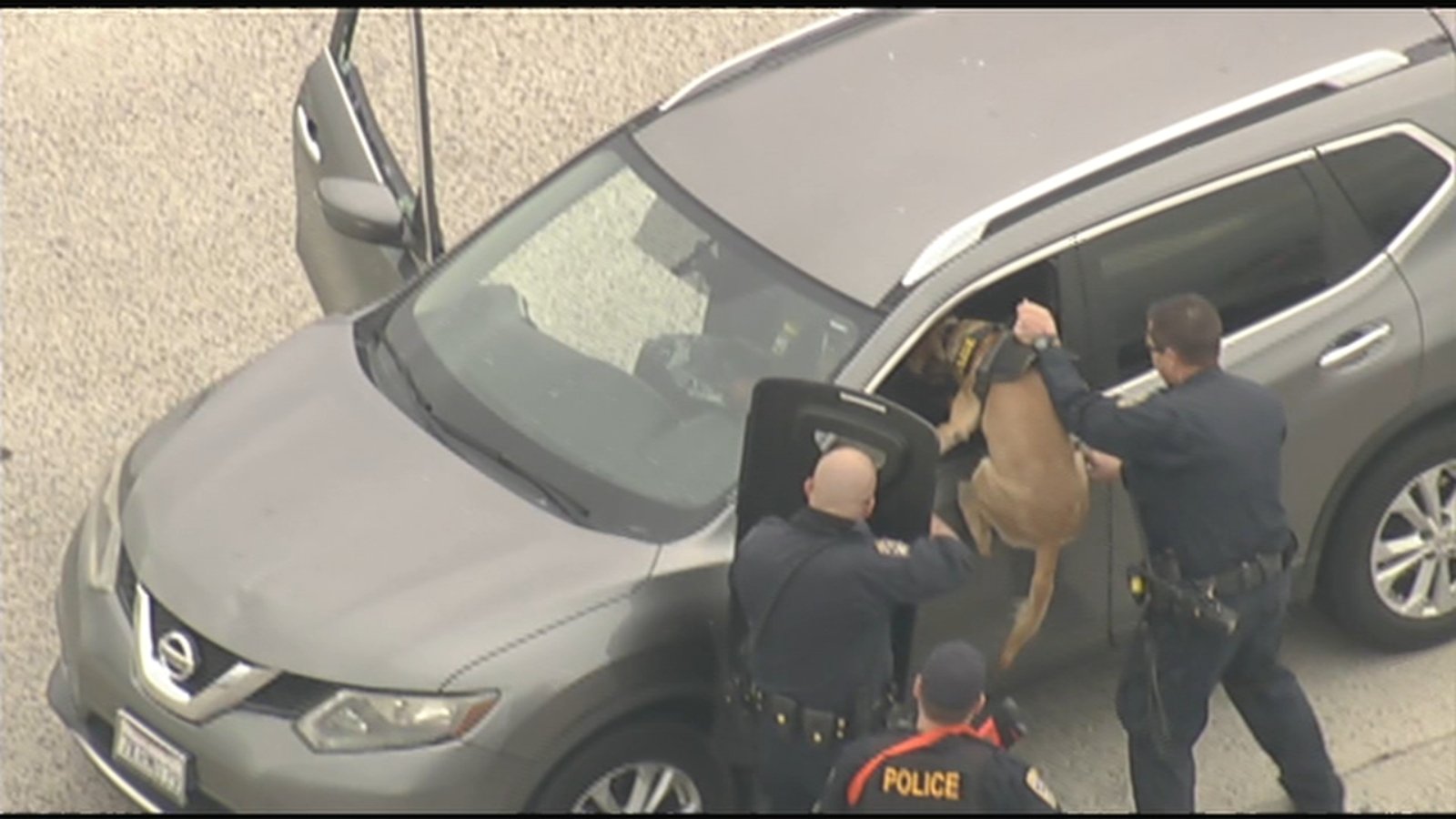 (KABC) — A police dog helped subdue a suspect after a lengthy standoff on the 15 Freeway in Ontario that left traffic backed up for miles. The stolen-car suspect had stopped on the northbound 15 and refused to exit his vehicle after a chase from the Azusa area.