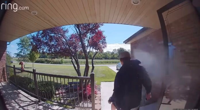 The Ring camera footage recorded on July 31, at 11 a.m. shows the man, wearing a baseball cap, blue hoodie, grey T-shirt and shorts as he stands in front of the door, ring the bell repeatedly.